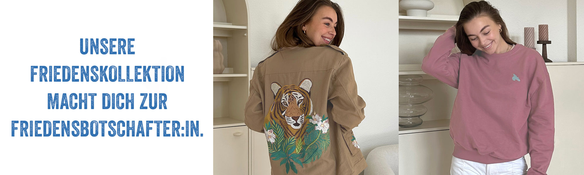 Das Unisex Sweatshirt mit der Botschaft „Peace & Freedom“ in 20 Sprachen kommt aus Indien. Das Friedensarmband aus Nepal. In jedem Fall gilt: Es werden Frauenprojekte unterstützt. Es werden faire Löhne und gute Sozialleistungen bezahlt. Wer unsere Friedenskollektion bestellt kann sich sicher sein: Wir reden nicht nur, wir handeln.