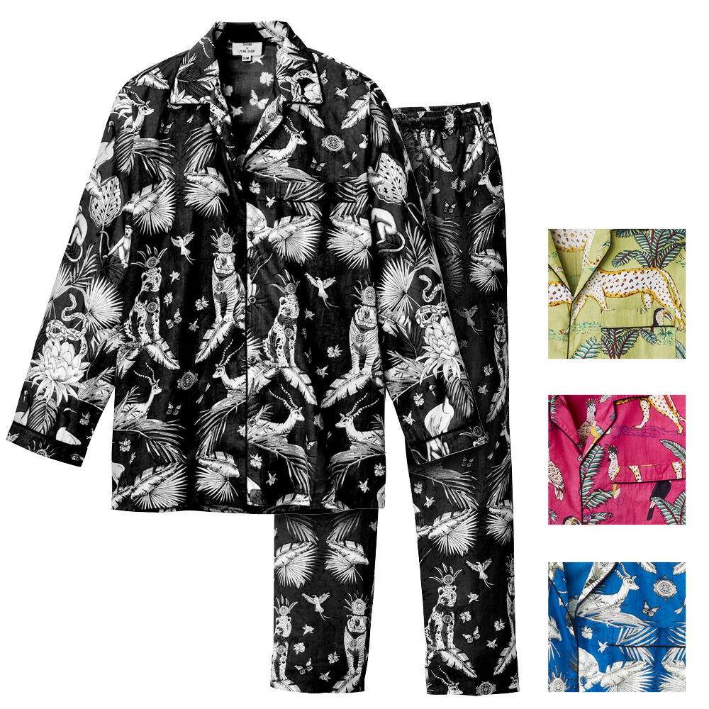 El estampado rosa brillante del pijama está inspirado en la flora y la fauna del Parque Nacional de Rhantambore, en la India, de donde procede el pijama. Se ha estampado a mano con gran esmero y tiene un acabado de gran calidad.