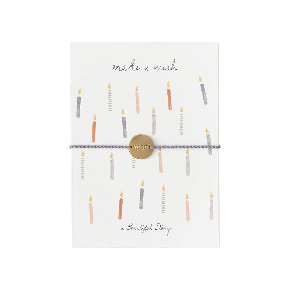 La tarjeta con las velas de cumpleaños y el texto "pide un deseo" está envuelta en una pulsera de hilo de cera de algodón y adornada con una moneda hecha a mano con la inscripción "wish".